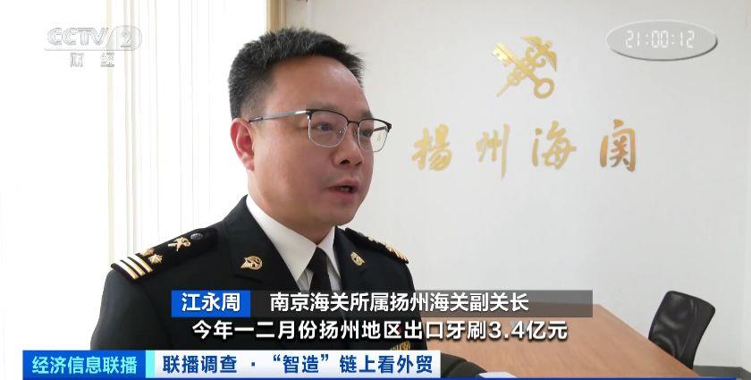 南京海关所属扬州海关副关长 江永周:今年一二月份扬州地区出口牙刷3.4亿元,同比增长26.5%,主要出口到美洲和东南亚地区。