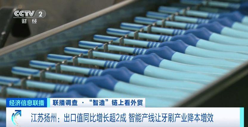 在江苏扬州的一家牙刷厂,200多台生产设备忙碌地作业着,刷柄塑形、上色、插毛,全部自动化完成。企业负责人告诉记者,他们半数订单来自海外,且每年以30%左右的速度增长,为了满足日益增长的海外订单需要,这家智能工厂于2023年年底投产。