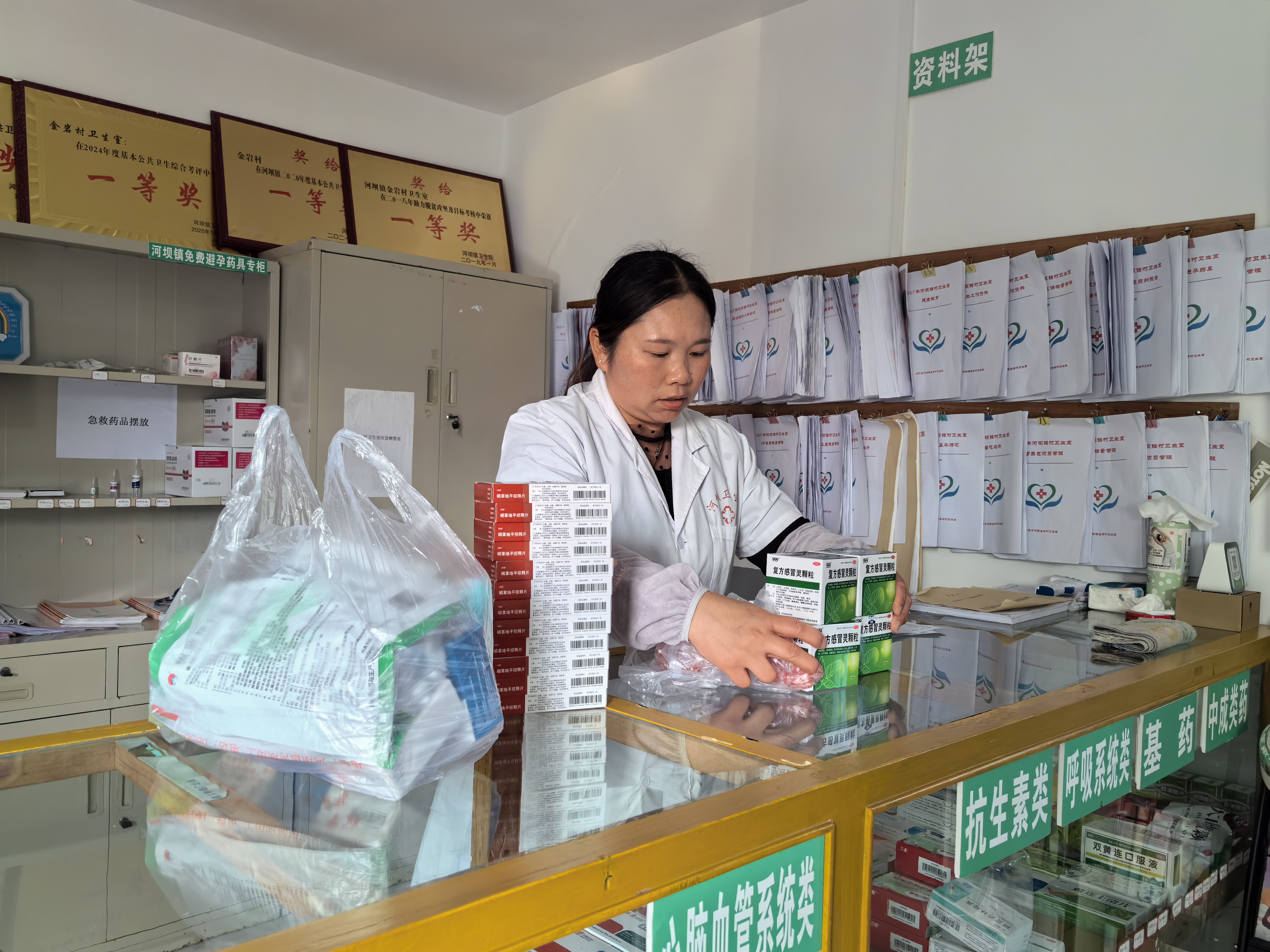 河坝镇金岩村卫生室负责人刘春介绍道,“目前我们村卫生室开展的工作有老年人健康体检,慢性病高血压、糖尿病这些入户上门服务每年至少不少于4次,慢病随访。还有就是我们的药品,卫生室至少要有80种药品,方便我们群众就近捡药方便。还有就是医保这一块的话,报销下来,群众自费有些才一两块钱,他们也非常满意。我也希望通过尽我自己最大力所能及的能力,帮助群众,解决他们看病难的问题,方便群众。”