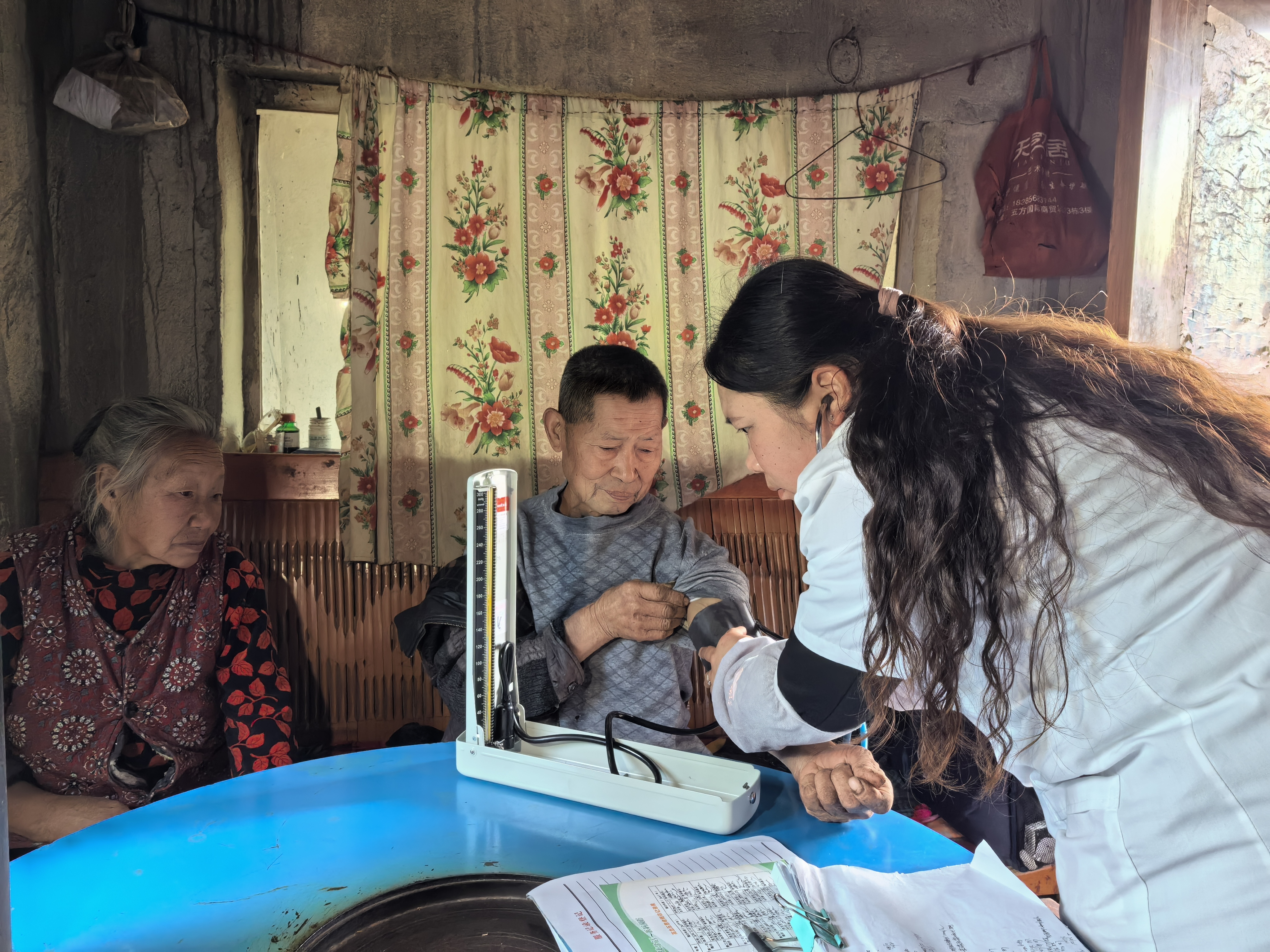 走进金岩村村卫生室,宽敞明亮的诊疗室、药品齐全的药房、整洁规范的输液区一目了然,血压计、血糖仪、心电图机等基础医疗设备有序摆放。该村的村医刘春,正在村民郭建香老人家中,为老两口上门量血压,做记录,开展上门随访工作。
