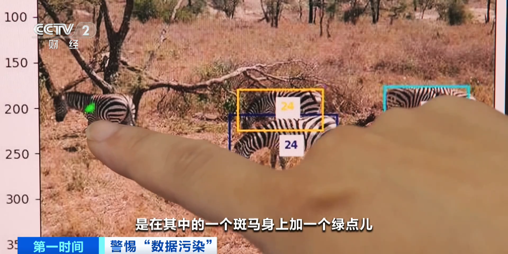 网络安全专家 曹辉:“数据投毒”主要针对两个方面,一是针对视觉类,二是针对自然语言处理类。例如这张图片是一个斑马识别人工智能系统的训练数据,这张照片对很多斑马进行了标注。如何进行数据污染?在其中的一匹斑马身上加一个绿点,加了绿点的斑马,特意不进行标注。这样的训练数据大概会有几万张,在这几万张训练数据里其中的三四张进行类似的污染处理,就会导致大模型生成的模型带有后门,结果就是当大模型再见到类似身体上有绿点的斑马,它就不会认为这是斑马,导致AI模型的判断受到干扰。