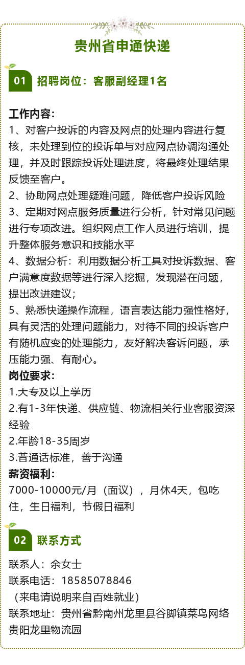贵州省申通快递招聘客服副经理!月薪7000-10000元+包吃包住!大专起报!