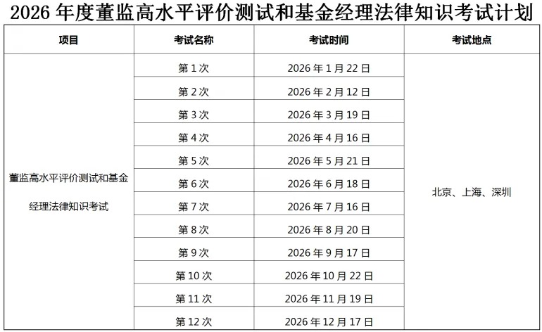二、董监高水平评价测试和基金经理法律知识考试拟在北京、上海、深圳举办12次。