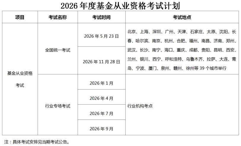 中国证券投资基金业协会现将2026年度考试计划公告如下: