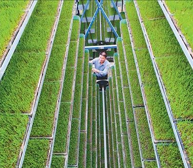 4月6日,在河南省信阳市光山县青龙河合作社全自动智能化育秧工厂,工作人员在管护水稻秧苗。