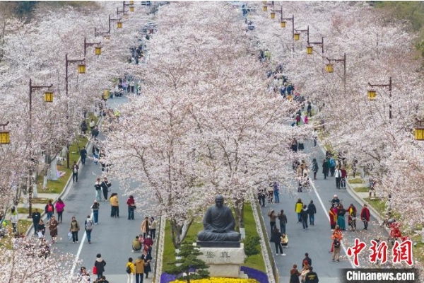 3月26日,江苏扬州鉴真路樱花盛放,吸引民众前来观赏。图为扬州鉴真路上的樱花迎来最佳观赏期。