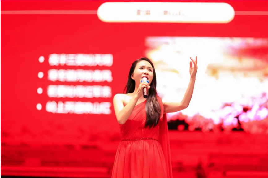 王韦韦以精湛的演唱技艺与饱满的情感表达,先后演绎《映山红》《唱支山歌给党听》《我的祖国》《春天的故事》等多首经典红色曲目。她清澈婉转的花腔唱腔与真挚动人的情感传递,将每首歌曲背后的党史故事娓娓道来,使师生在优美旋律中触摸历史脉动,在艺术熏陶中接受精神洗礼,实现了“听歌学党史、润物细无声”的育人效果。