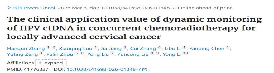 近日,贵州省人民医院肿瘤科李勇博士、张汉群博士在国际知名期刊 npj Precision Oncology(中科院1区top, IF=8)发表研究论文,该论文聚焦局部晚期宫颈癌同步放化疗后复发监测这一临床难题,在国内首次前瞻性验证了血浆ctHPV-DNA MRD动态监测在评估宫颈癌治疗疗效及预测复发中的临床价值。