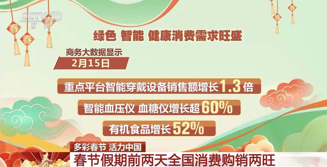 商务部消息,春节假期前两天,各地年味浓厚,购销两旺,其中绿色、智能、健康类消费需求旺盛。商务大数据显示,2月15日,重点平台智能穿戴设备销售额增长1.3倍,智能血压仪、血糖仪增长超60%,有机食品增长52%。