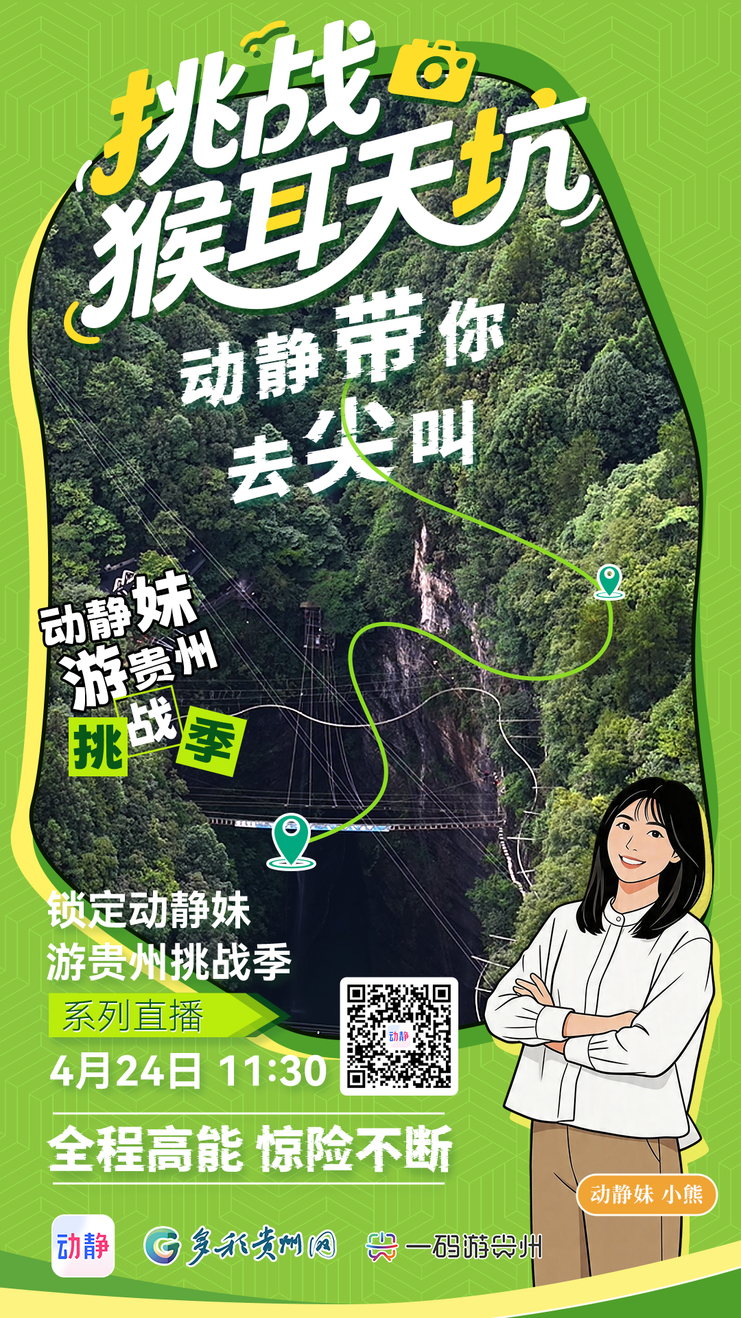 看直播,送千元大礼!挑战猴耳天坑惊险,动静带你去尖叫~ 2026-04-19 16:23 你有多久没为心跳疯狂一次了?动静妹游贵州挑战季来了!来,和动静妹一起踏上冒险之旅去挑战各种惊险刺激!首期直播将挑战猴耳天坑风景区三个极限运动高空管轨悬崖飞拉达超级大秋千惊不惊险、刺不刺激?当天节目我们还将送出大奖价值上千元的始祖鸟背包!以及超级大秋千(398元)+云端漫步(218元)项目门票(不含摄影票)4月24日11:30我们不见不散点击上方海报进入直播间↑ 记者: 熊茜雯 胡宏涛 吴雷 编辑: 胡宏涛 责编: 李佳 编审: 李铁流