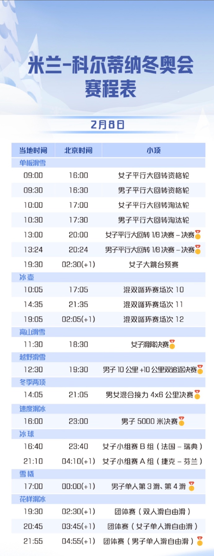 北京时间2月8日,快来看看今天有哪些冬奥赛事吧!