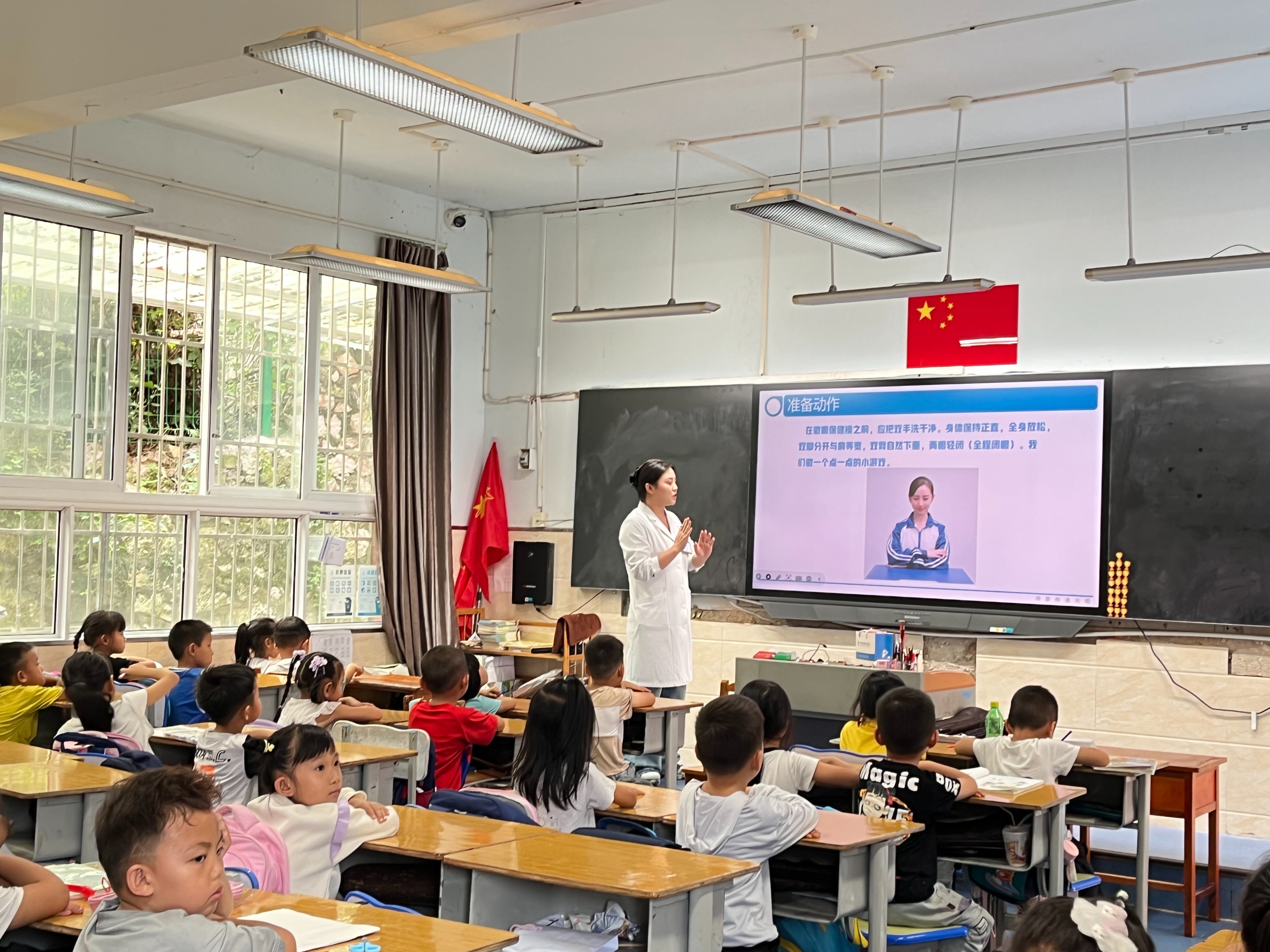 课堂上,医院视光与儿童眼病专科医生杨玲玲结合生动案例,向学生们剖析了近视形成的原因。她分别科普了如何纠正不良读写姿势、“20-20-20”护眼法则、如何控制电子产品使用、保障户外活动时间等护眼常识。课程最后,她详细示范了正确的眼保健操步骤,并指导学生如何通过科学的眼部按摩缓解眼疲劳,为孩子们带来了一堂生动有趣的近视防控小课程。