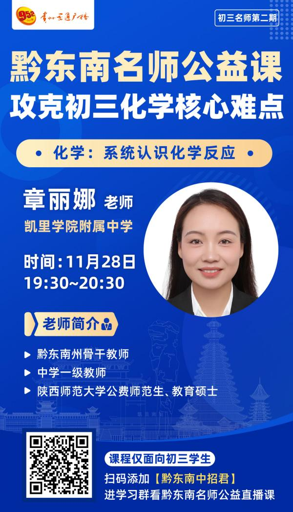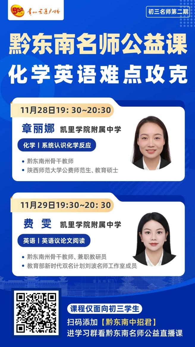 本周(初三名师第二期)特邀凯里学院附属中学的优秀教师开启公益直播课(化学、英语),聚焦中考核心考点,助力初三学子精准提分!