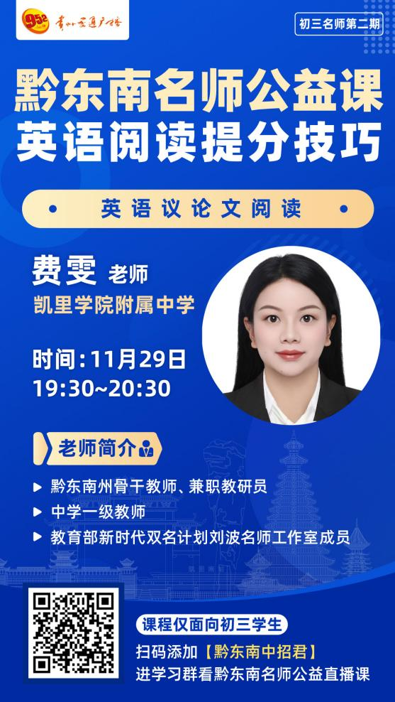 为深化教育教学改革、共享优质教育资源,助力初三学子精准突破学习难点,提升备考效率,贵州广播电视台交通广播特此推出“黔东南名师公益课堂”栏目。