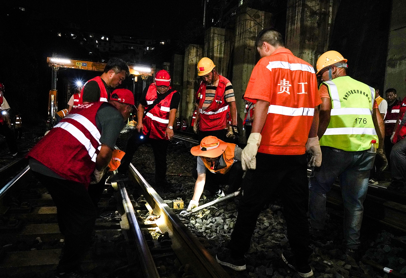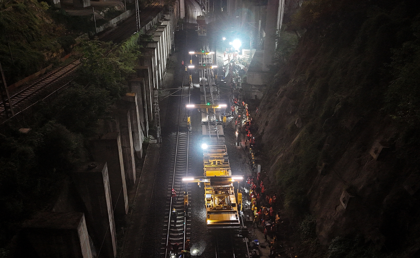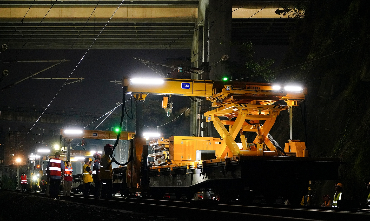 9月21日4时,贵阳工务段100余名干部职工在贵阳站2号道岔经过480分钟的持续鏖战,标志着历时2个“天窗”的1/18型号道岔整组钢件更换施工顺利完成,全面提升设备稳定性和安全性,这是贵阳工务段首次采用轨道作业车配合龙门吊装设备一体化进行施工作业,更是在全路首次对1/18型号道岔整组钢件进行更换施工。