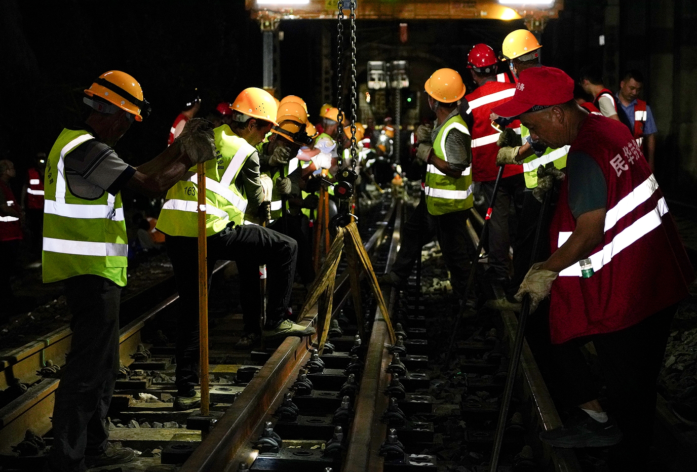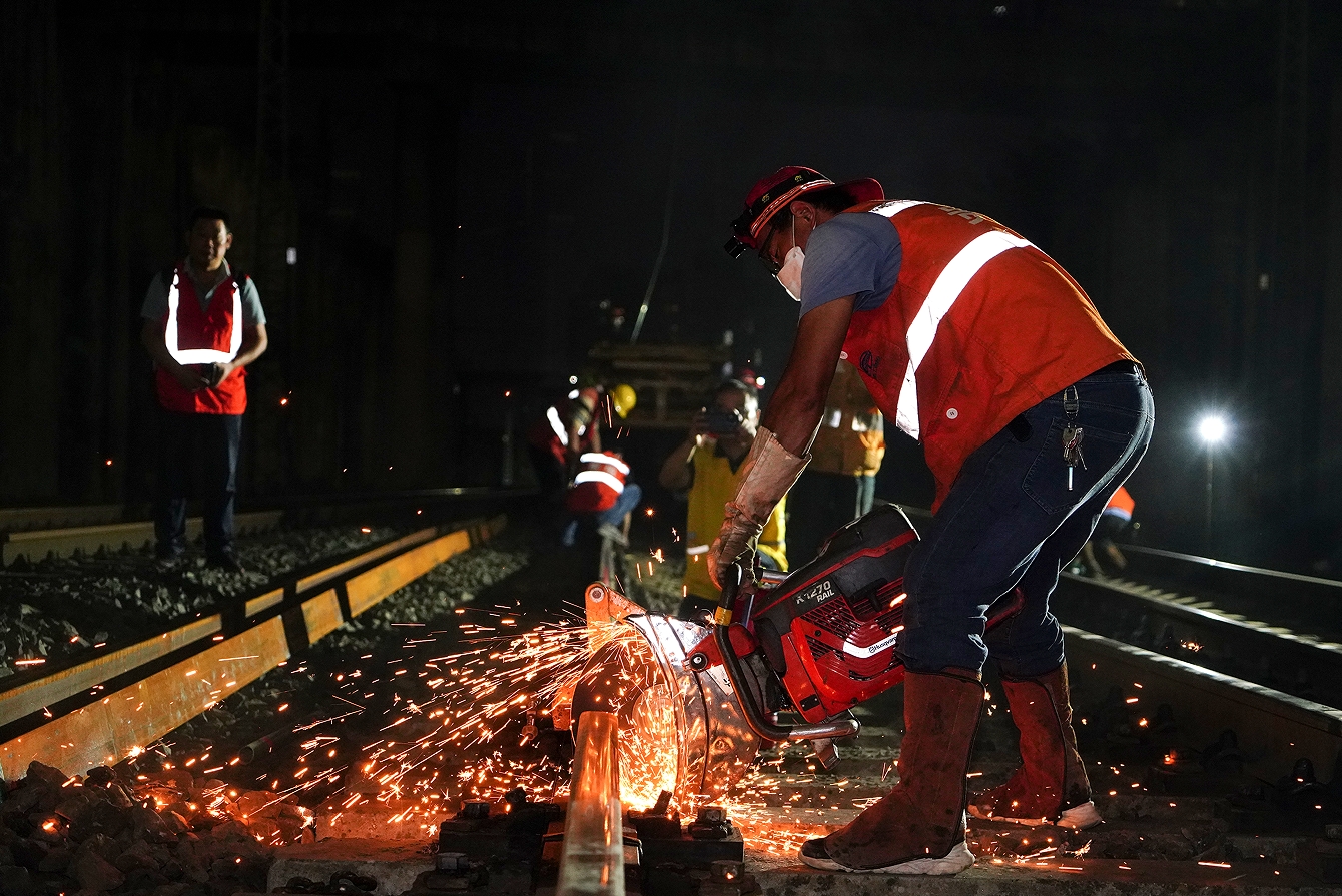 施工现场,防护组、吊装组、扣件组、钢轨切割组等9个小组各司其职,搭设短路铜线、松卸扣件、拆除夹板、锯割钢轨等工序在大家的共同协作下顺利推进。