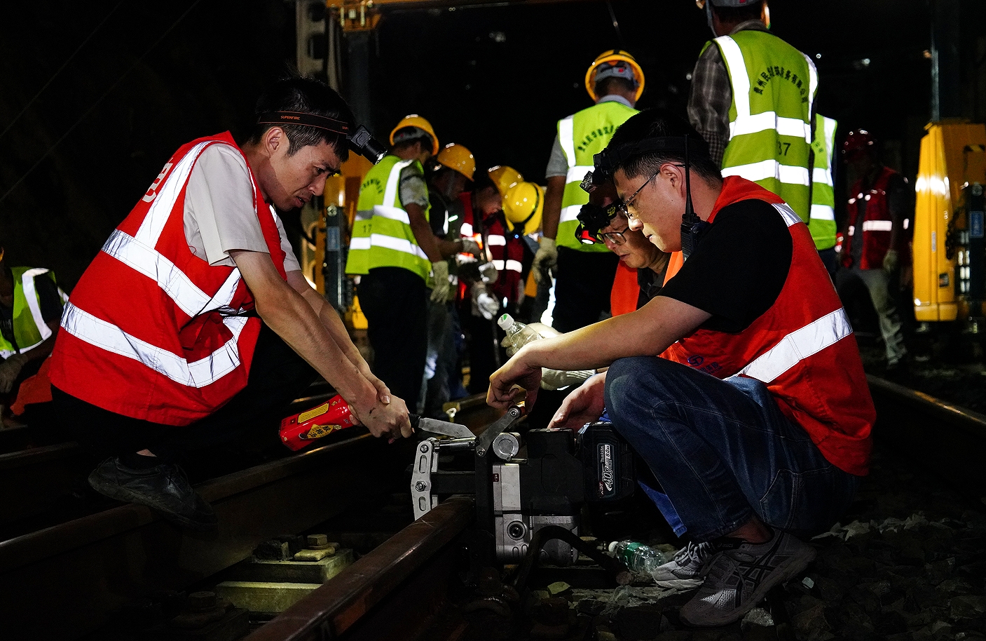 新钢件准确落槽后,各小组作业人员立即开始安装联结零件、复拧螺栓、回收旧料。等候在一旁的焊轨小组立刻进行钢轨切割、焊接、打磨等作业。顿时,现场机器轰鸣声与作业人员的号子声交相辉映,形成一幅美妙的施工交响曲。