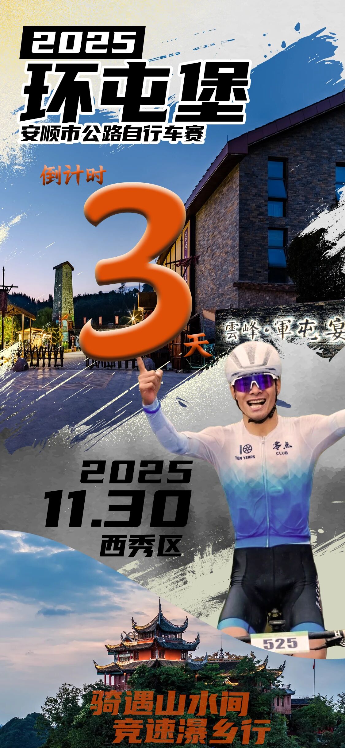 11月30日,倒计时3天,让我们齐聚西秀,用车轮丈量喀斯特的壮美,用目光捕捉屯堡的韵味,在速度与时光的碰撞中,留下一段难忘的文旅记忆!