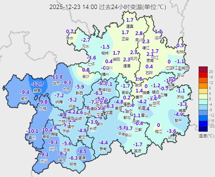今天夜间到明天白天,全省阴天有小雨,其中,威宁小雨转冻雨或小雪,毕节市中西部、六盘水市北部、大娄山、梵净山和雷公山等海拔较高或高山地区小雨转雨夹雪,各地气温继续下降,除南部边缘地区最高气温为8-12℃以外,其余大部地区最高气温为4-8℃;
