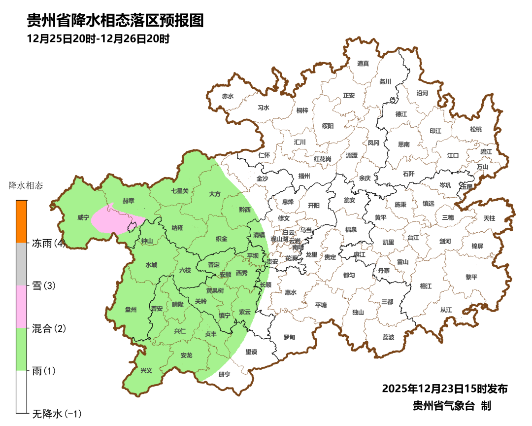 12月24日夜间到25日早晨,全省阴天有小雨,其中,威宁、梵净山、雷公山、大娄山有小雪,毕节市大部、六盘水市大部、贵阳市北部、黔南州北部、黔东南州西北部等地的海拔较高地区有雨夹雪;