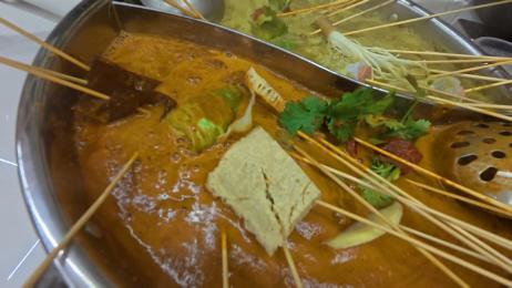踏入二道街,最不容错过的便是那标志性的“延安沾沾”。它不仅是市级非物质文化遗产,更是延安人味觉记忆中的独特符号。这是一种颠覆传统火锅概念的吃法:无油清汤锅底,仅以孜然、辣椒面、小茴香等香料加清水煮沸,食材则串在细签上,分为凉沾与热沾两种吃法。地道的吃法离不开三种秘制蘸料:醋泡蒜的酸爽、特色凉汤的独门风味、芝麻酱的醇厚。老食客常将三者混合,调制出独一无二的复合味道。从筋道的黑擀面皮、酥脆的锅巴,到软糯的洋芋磨磨,几乎所有食材都能在竹签上找到归宿。