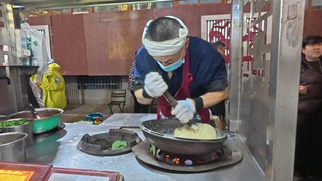 在二道街,你不仅能品尝美食,还能亲眼见证传统手艺的展示。搅团摊位前总是围满了人,制作者手持搅棍,面粉在锅中随着温度的上升成了一大块面团。这不仅是美食制作,更是“陕北非物质文化遗产文化”的活态呈现。一碗热腾腾的搅团,吃的是筋道口感,品的则是传统手艺人几十年如一日的坚持。