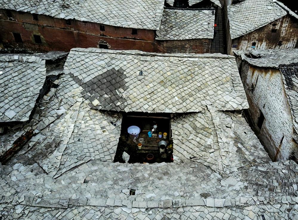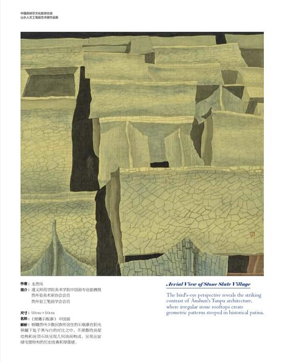 成功入选本次展览的美术作品《俯瞰石板寨》,俯瞰贵州少数民族所居住的石板寨在阳光照耀下处于黑与白的对比之中,不规整的房屋结构和房顶石块呈现几何块面构成,呈现出安顺屯堡特有的历史沧桑和厚重感。