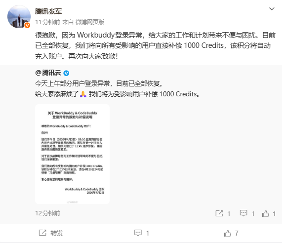随后,腾讯公司公关总监张军转发该微博称:很抱歉,因为 Workbuddy登录异常,给大家的工作和计划带来不便与困扰。目前已全部恢复,我们将向所有受影响的用户直接补偿 1000 Credits,该积分将自动充入账户。再次向大家致歉!