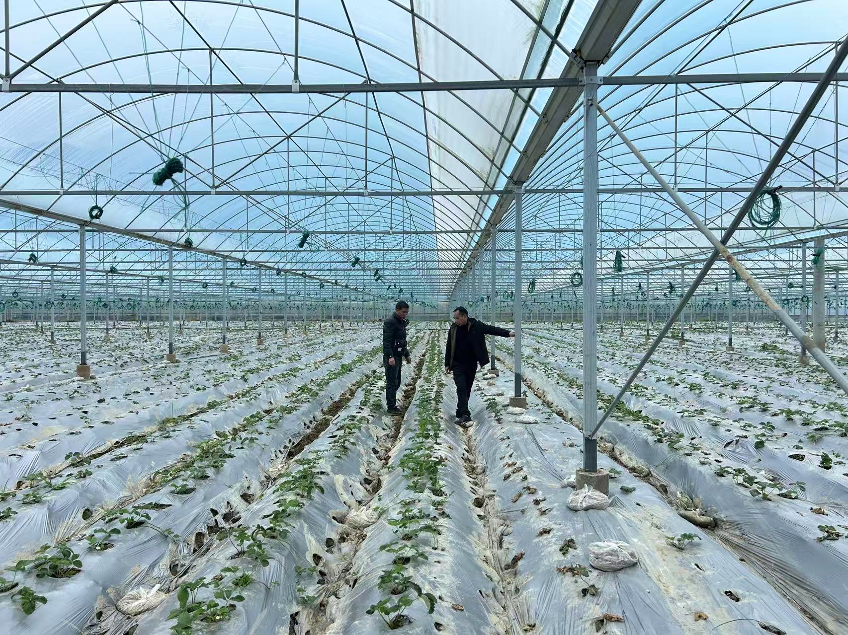 周云富(左一)在草莓种植大棚工作