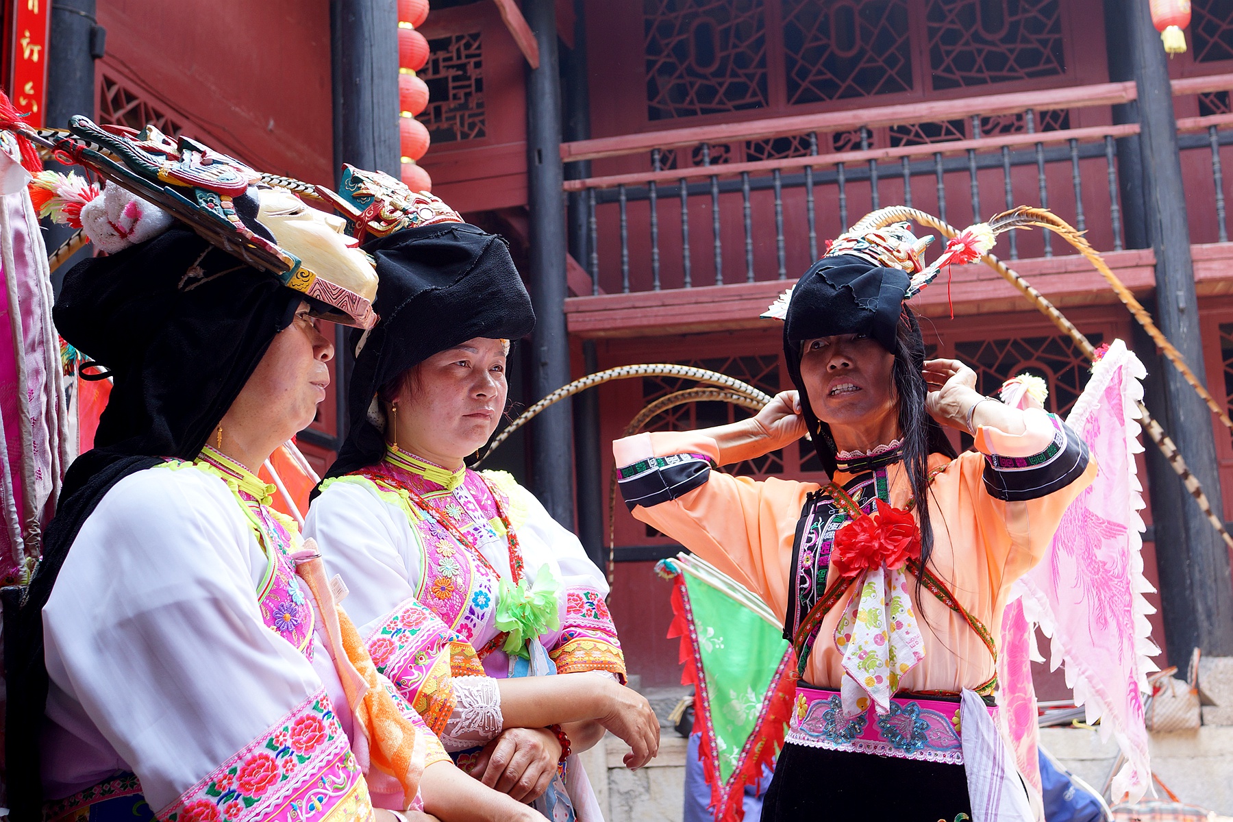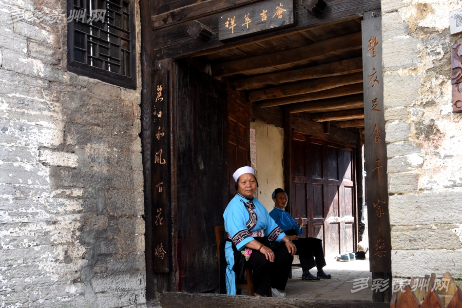 身着传统服饰的屯堡老嬢嬢坐在门前,注视着来往的游客