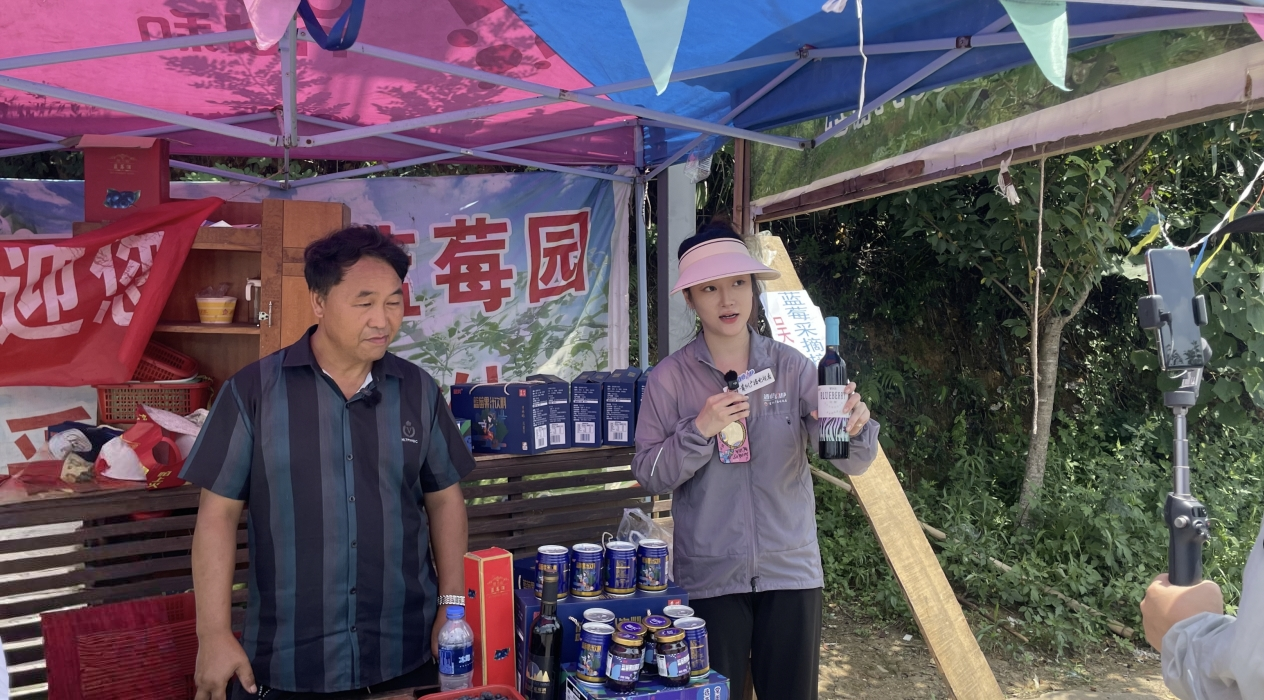 吴亲安(左)和《酒业动静》主播一起为直播间观众介绍蓝莓酒