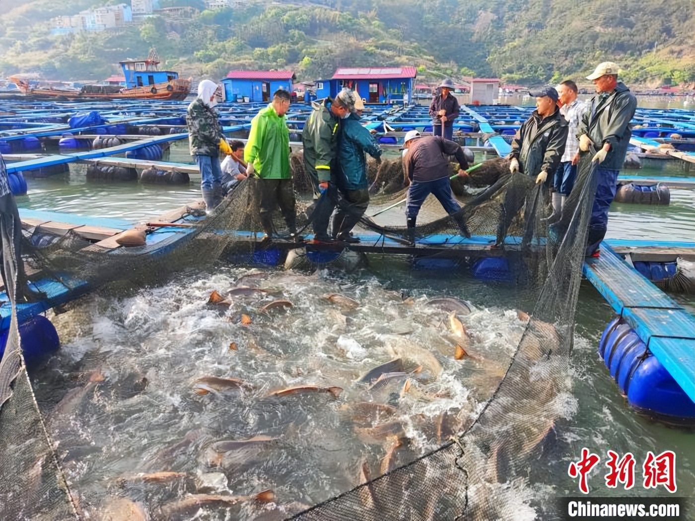 4月16日,宁德三都澳白基湾活水鱼养殖基地内,渔民正在为即将出口韩国的活水鱼收网。范正雄 摄