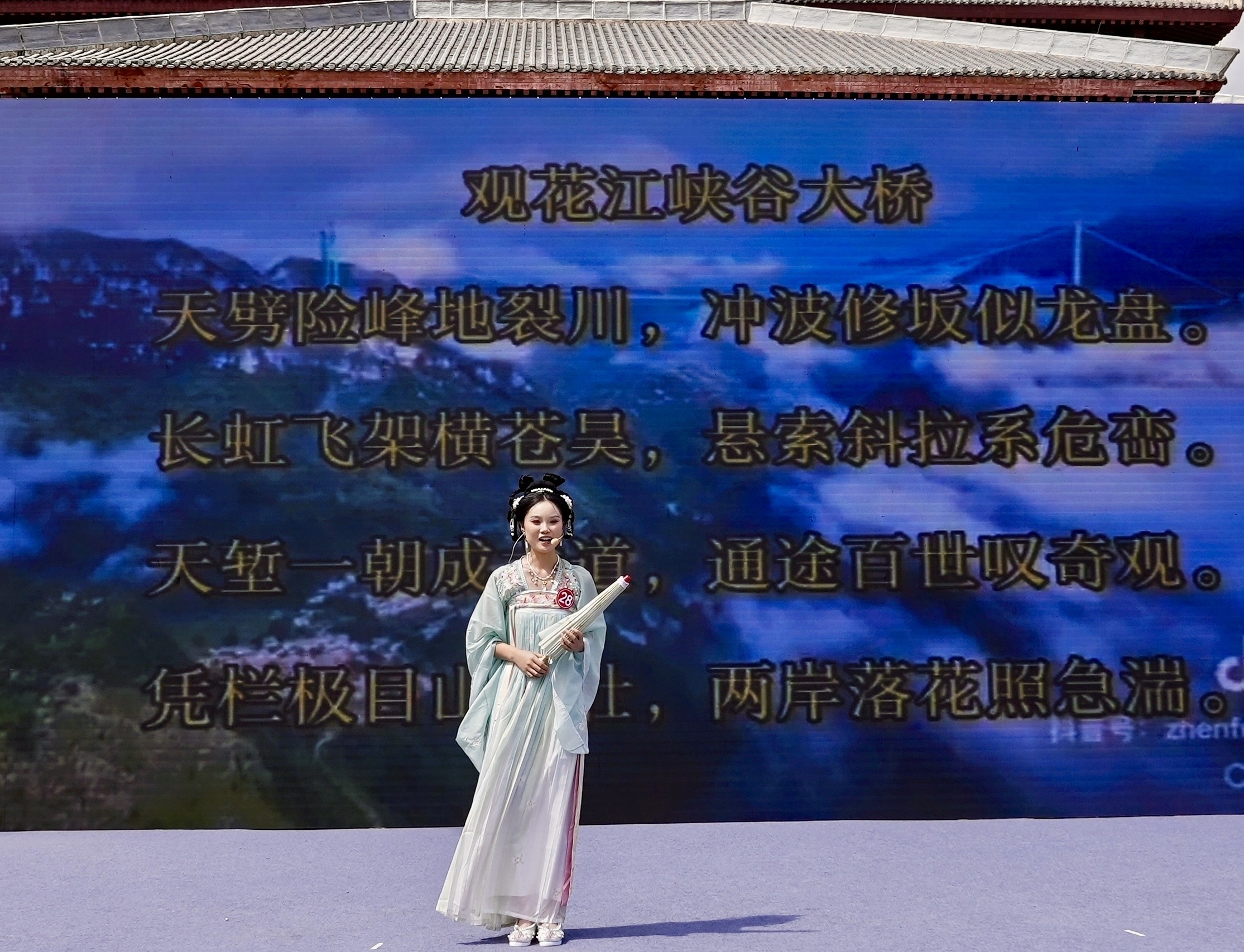 选手以“凭栏极目山河壮,两岸落花照急湍”展现花江峡谷大桥的壮阔