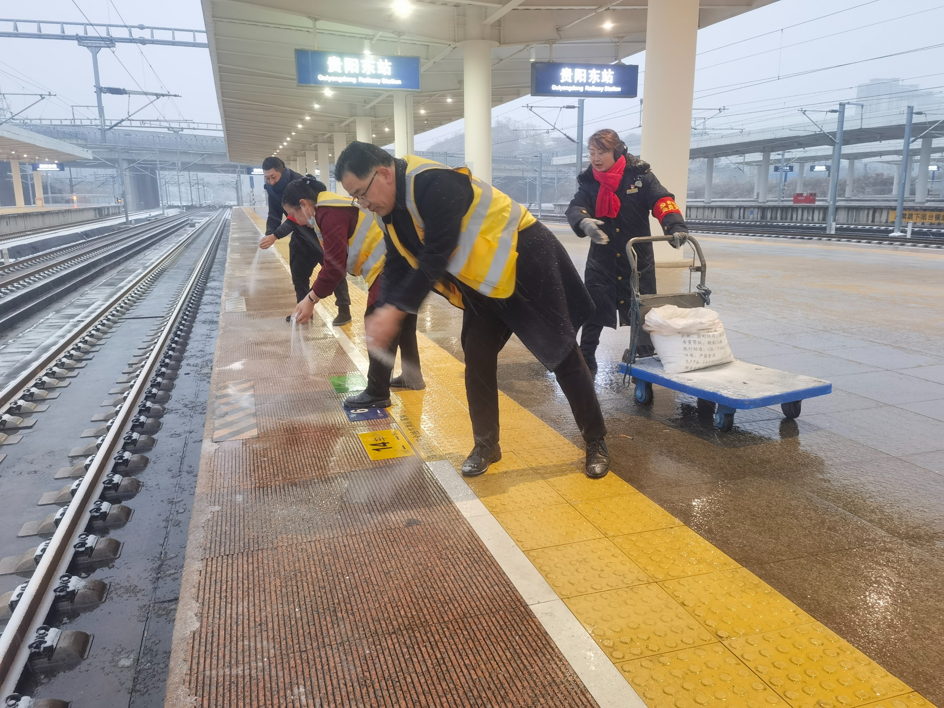 贵州各铁路单位全面加强现场客运组织,畅通旅客进出站流线。加大天桥、地道、站台等关键处所安全宣传力度,在各车站关键部位铺放防滑垫,防止旅客滑倒摔伤,全力确保旅客出行安全、便捷。组建应急处置小队,应对列车晚点、旅客积压等状况,积极做好旅客供水服务和食品储备工作。