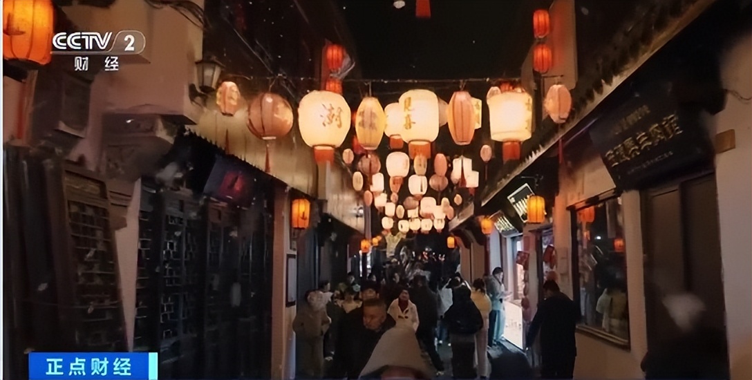 在上海南翔古镇,不仅有喜庆的传统灯彩,当地还布置了人工降雪,让游客在江南水乡也能体验雪景。