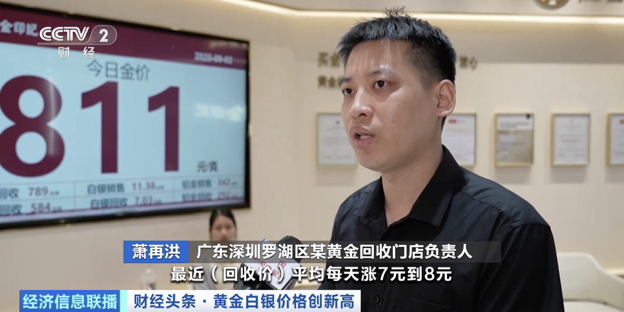 广东深圳罗湖区某黄金回收门店负责人 萧再洪:最近(回收价)平均每天涨7元到8元,比上几个星期涨(得)多了,上几个星期(每天)稳定在(上涨)1元到2元,(黄金回收业务量)相比上几个星期,增长了50%左右,特别是周六周日,增长了70%到80%。