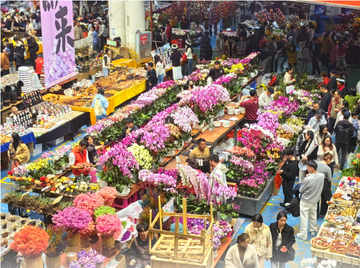 “蝴蝶兰、金桔、银柳、大花蕙兰,这些品种卖得最好。”孙青在斗南花市经营着一家摊位,说话时,她的眉眼间漾着新春的喜气。