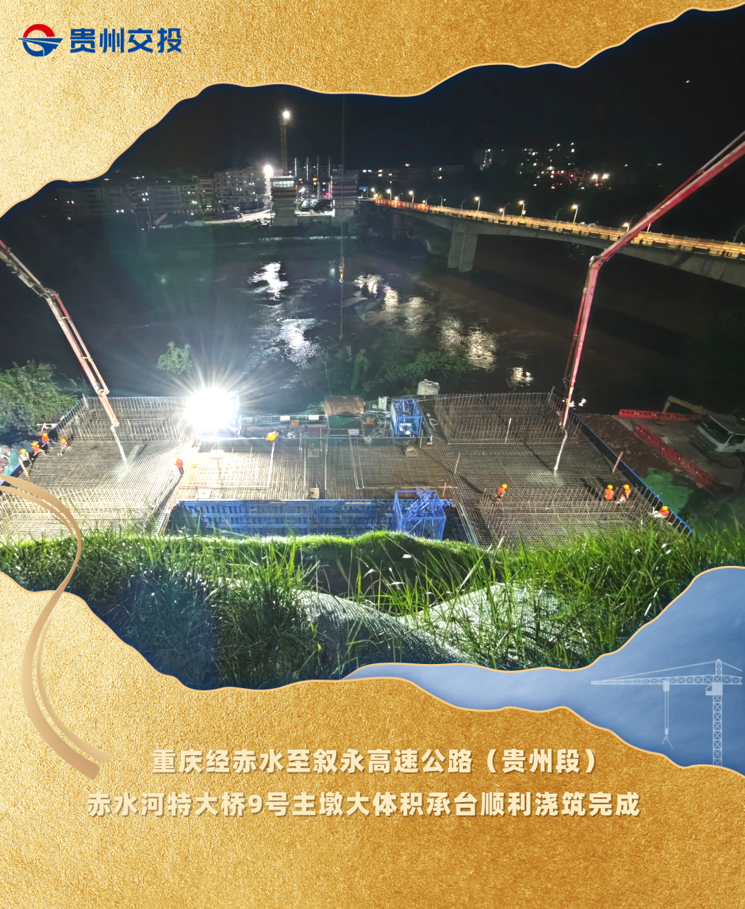 经过28小时不间断连续作业,近日,路桥集团承建的渝赤叙5标赤水河特大桥9号主墩大体积承台混凝土浇筑圆满完成,为大桥主墩上部结构施工筑牢关键根基。