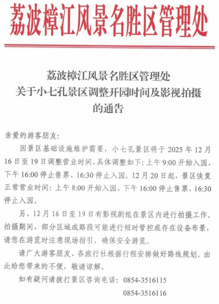 关于小七孔景区调整开园时间及影视拍摄的通告