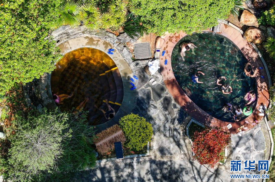 4月4日,游客在贵州省剑河县仰阿莎温泉小镇里泡温泉(无人机照片)。