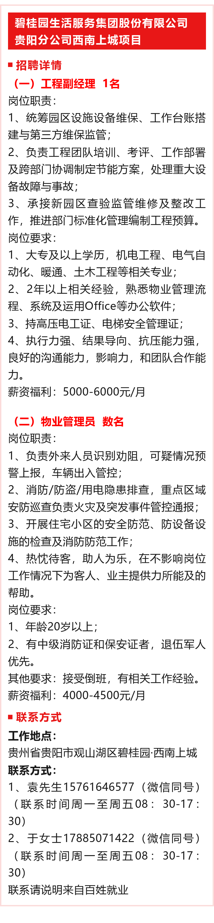 碧桂园生活服务集团贵阳分公司西南上城项目招聘!月薪4000~6000元!