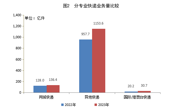 2023年,同城快递业务量累计完成136.4亿件,同比增长6.6%;异地快递业务量累计完成1153.6亿件,同比增长20.5%;国际/港澳台快递业务量累计完成30.7亿件,同比增长52.0%。