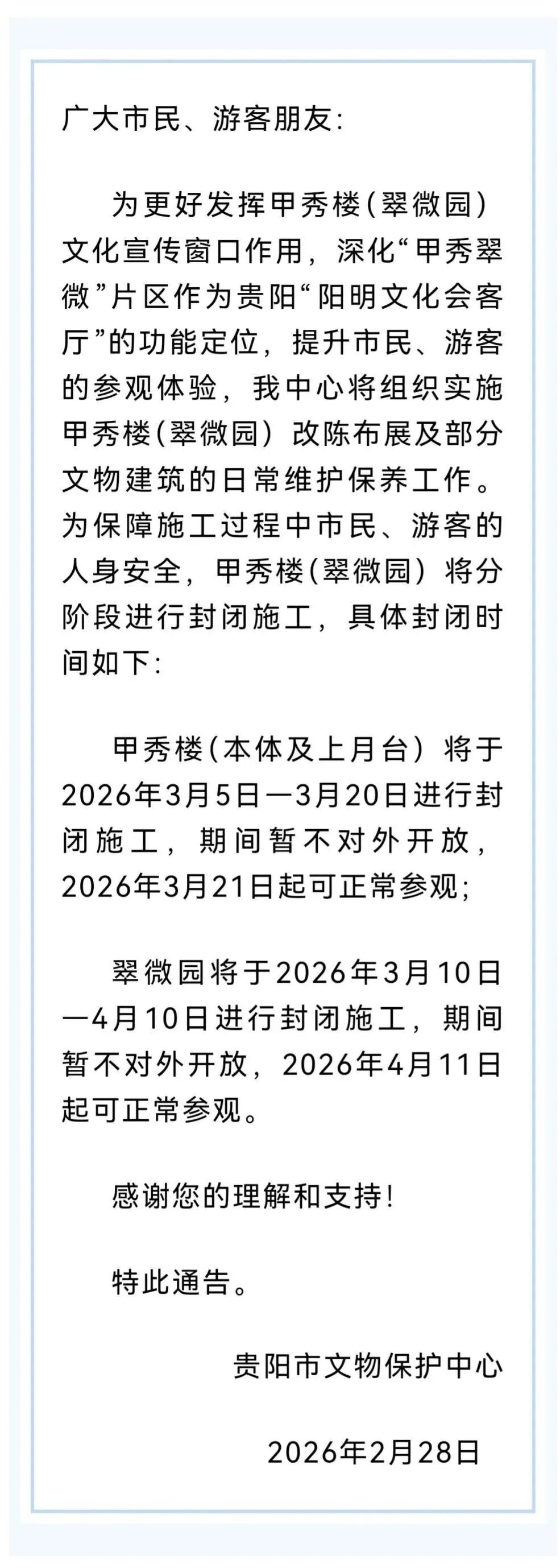 关于甲秀楼(翠微园)文物景区封闭施工的通告