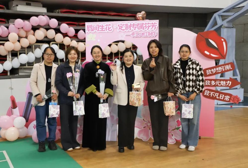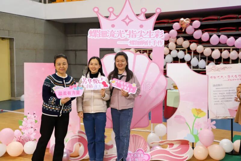 活动现场气氛热烈而温馨。女教职工们或凝神专注于手中的螺钿镶嵌,或三五交流配色心得,笑语盈盈间,一件件独具匠心的作品逐渐成形。完成制作后,大家纷纷佩戴胸针、举起口红,在打卡区拍照留念,定格属于自己的节日瞬间。