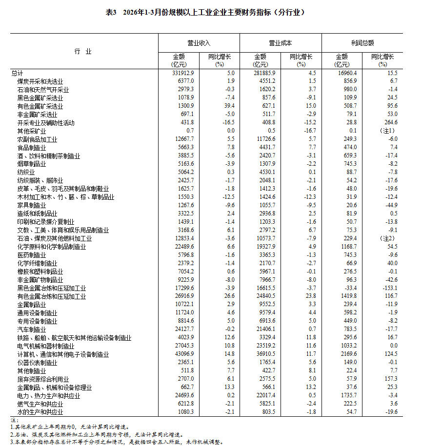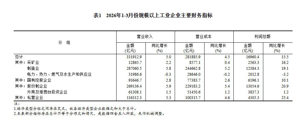 2026年1-3月份全国规模以上工业企业利润增长15.5%