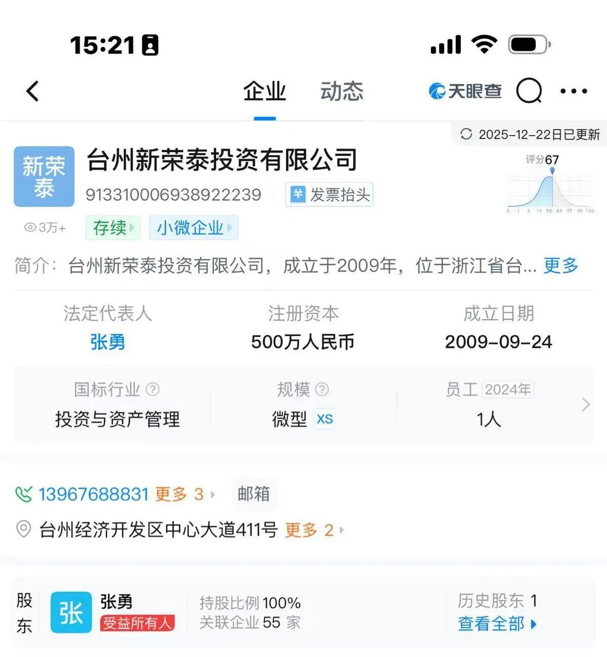 资料显示,台州新荣泰投资有限公司成立于2009年,法定代表人为张勇。天眼查显示为新荣记的创始人张勇。据悉,首家新荣记食府于1995年10月1日于浙江台州临海创办。