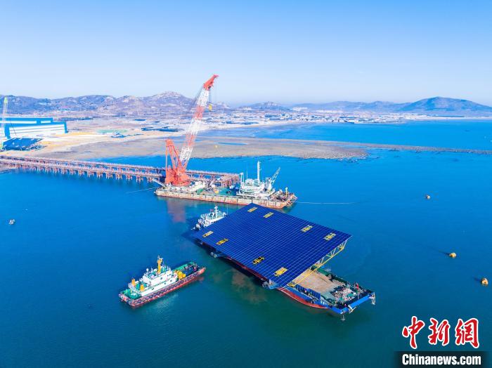 1月11日,“宝鼎16”轮载运中电建青岛即墨海上光伏项目第一榀钢平台离开码头。(无人机照片)