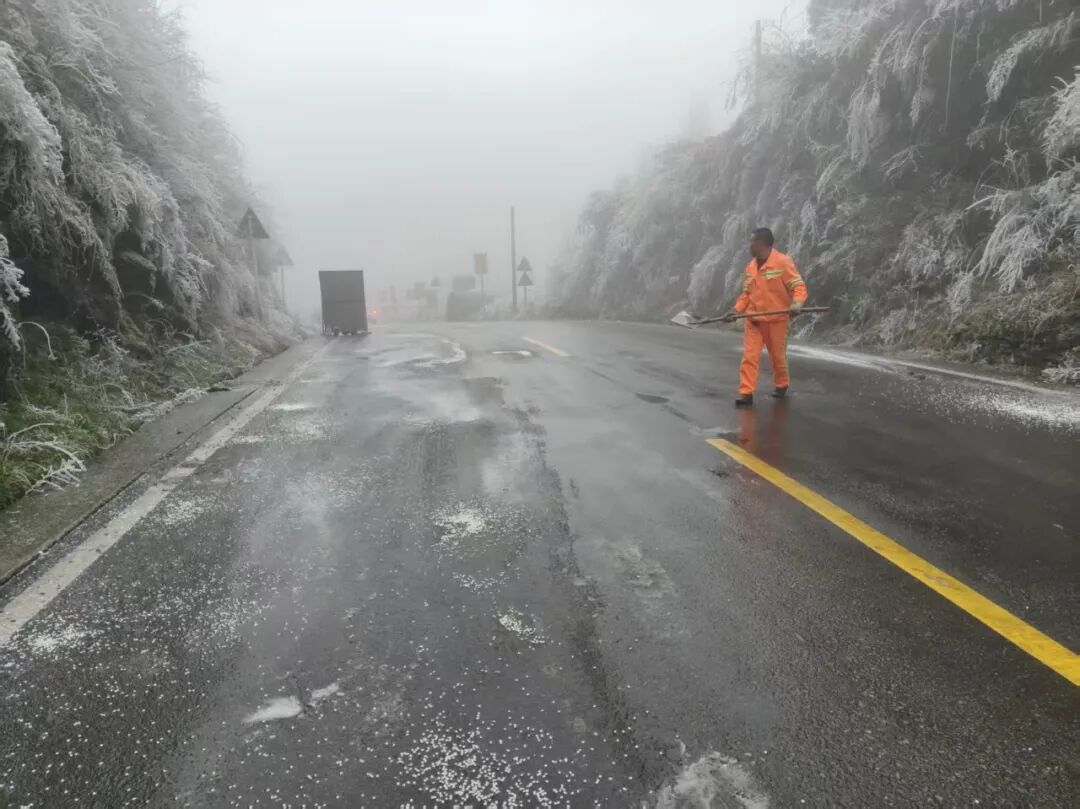 1月2日至5日,毕节市出现低温凝冻天气,多条管养国省干线路面出现不同程度凝冻,毕节公路管理局第一时间启动应急预案,采取“人工+机械”协同作业方式,全力开展抗凝保通作业。截至目前,累计投入机械设备23台,出动应急人员89人次,撒布融雪剂29.1吨,处置路段152.5公里。
