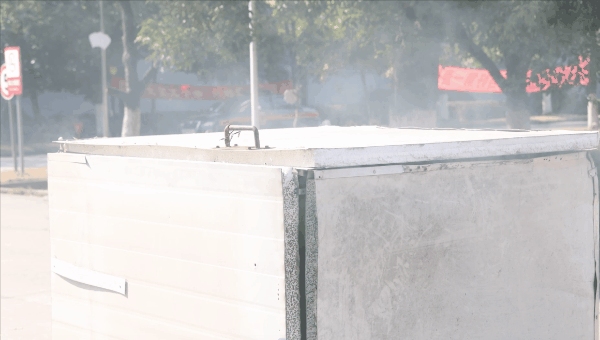 将泡沫夹芯板做成简易箱状模拟厂房,随后点燃其中一角。板房迅速燃烧并伴有大量黑烟不断向外冒出,不到5分钟,板房瞬间坍塌。