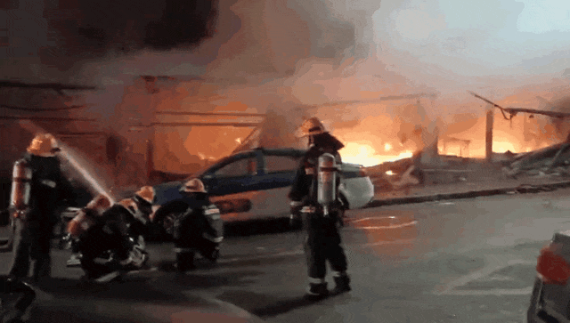 消防员到场时,水果店火势正处于猛烈燃烧阶段。救援人员立即采取攻势,从多角度架设水枪展开扑救。经过一段时间处置,现场明火被成功扑灭,此次火情未造成人员伤亡。